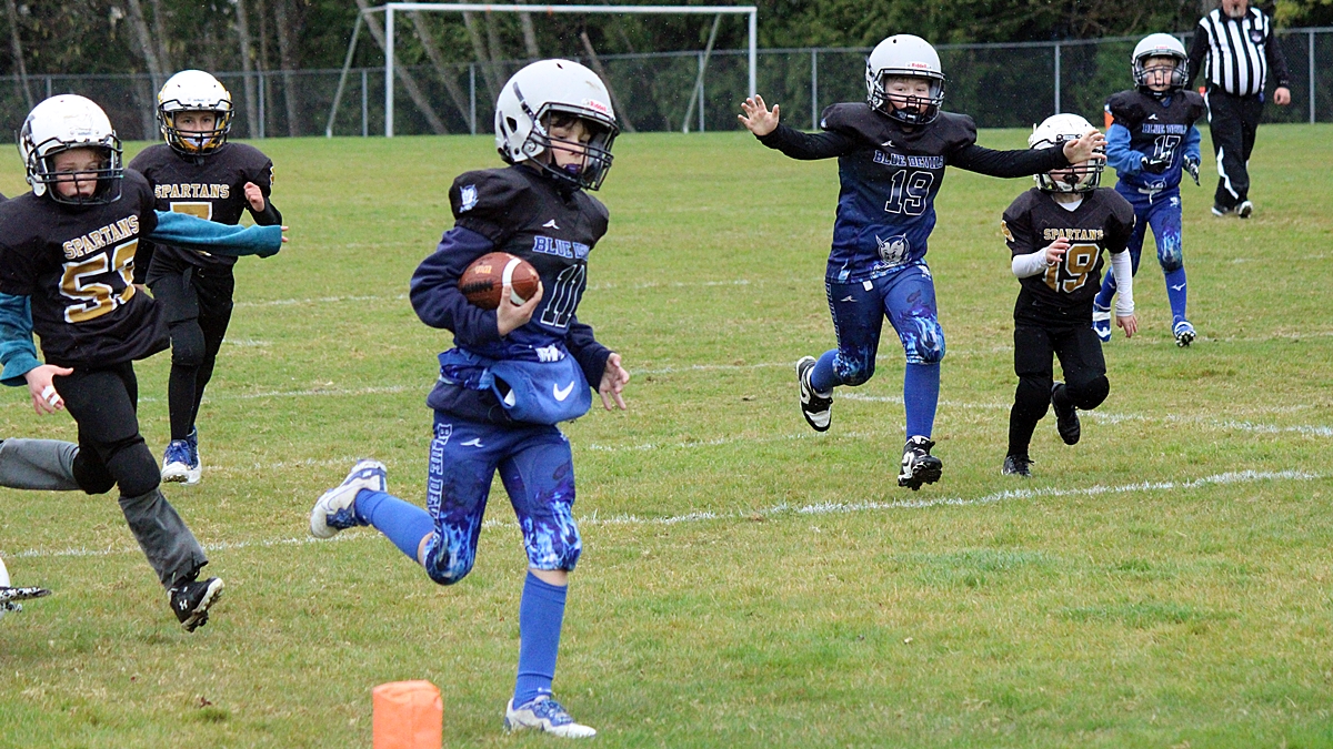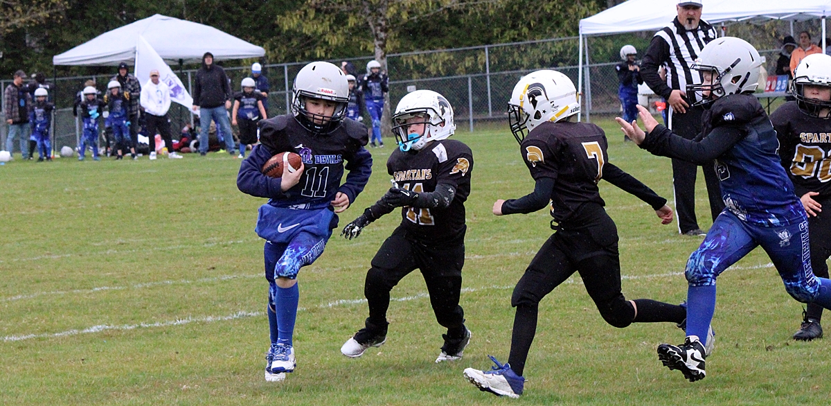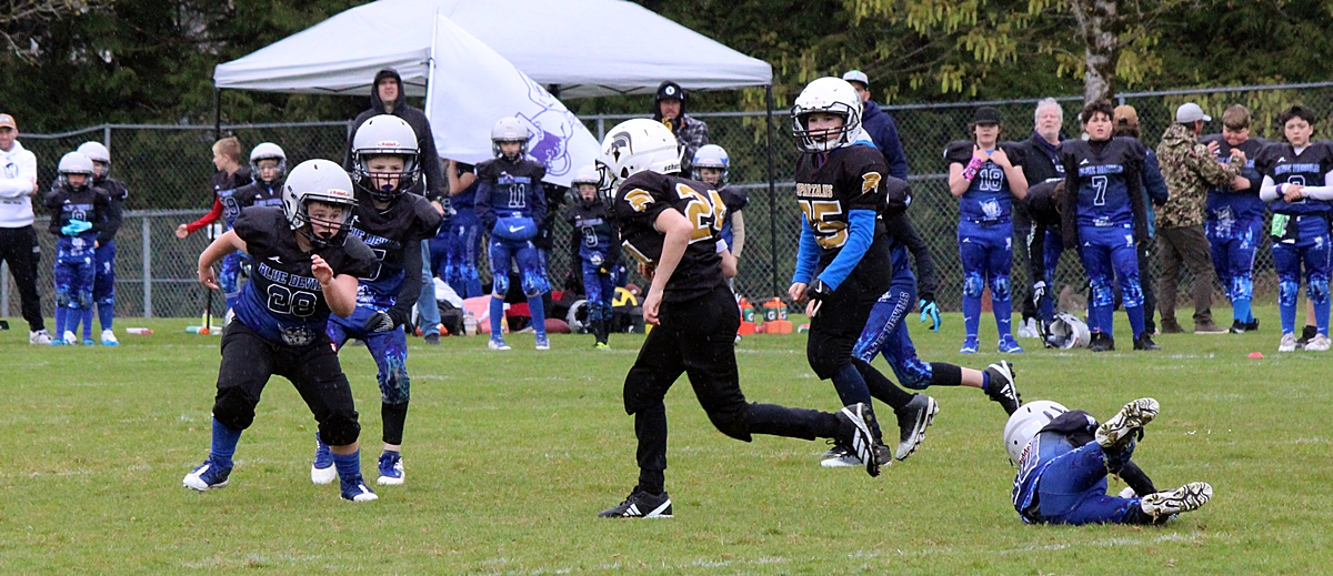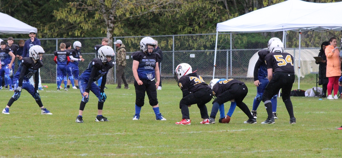 This weekend was overcast with a bit of drizzle but it didn’t stop sports activities from proceeding in Sooke. After our customary stop at Tim Horton’s for coffee we dropped by EMCS where the Blue Devils Junior Football program were having their home opener. They were hosting the Spartans from Victoria. There was a good crowd on hand and the EMCS parking lot was full. We took a number of photos of the first game, we’re guessing the Atom age group (7-9). Afterwards we dropped by the Horseshoe Pitching Association to get some photos of their renovations, scroll to the end to see those. If you use photos, please give credit to sookesports.ca in your posts.