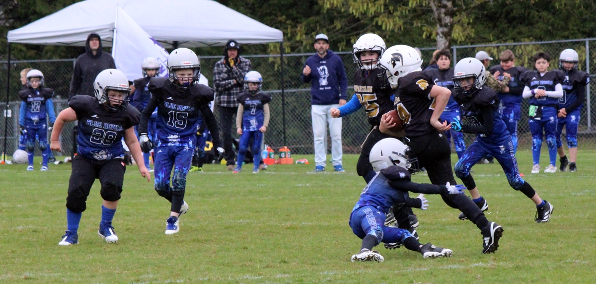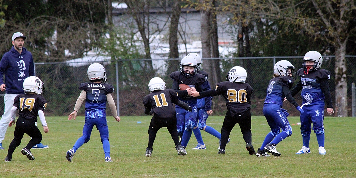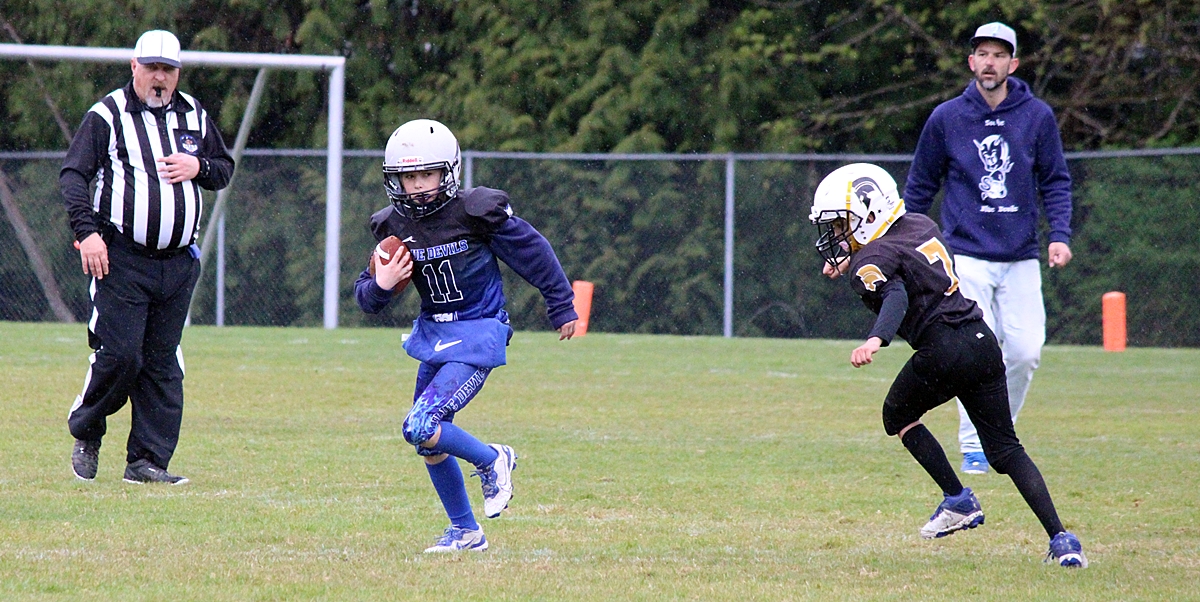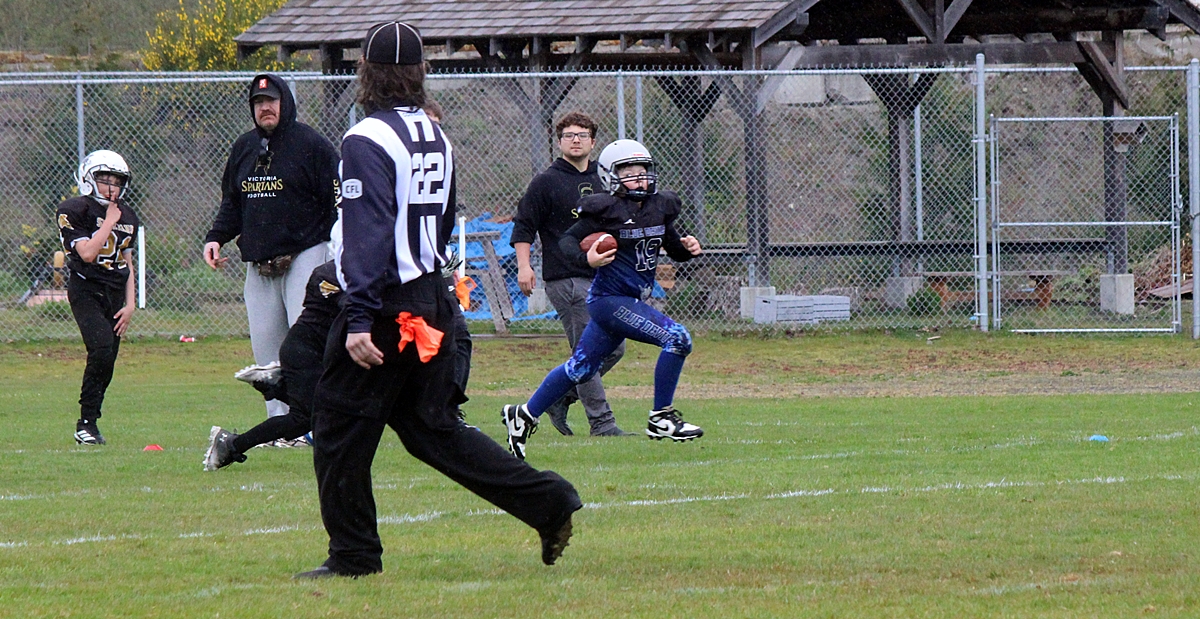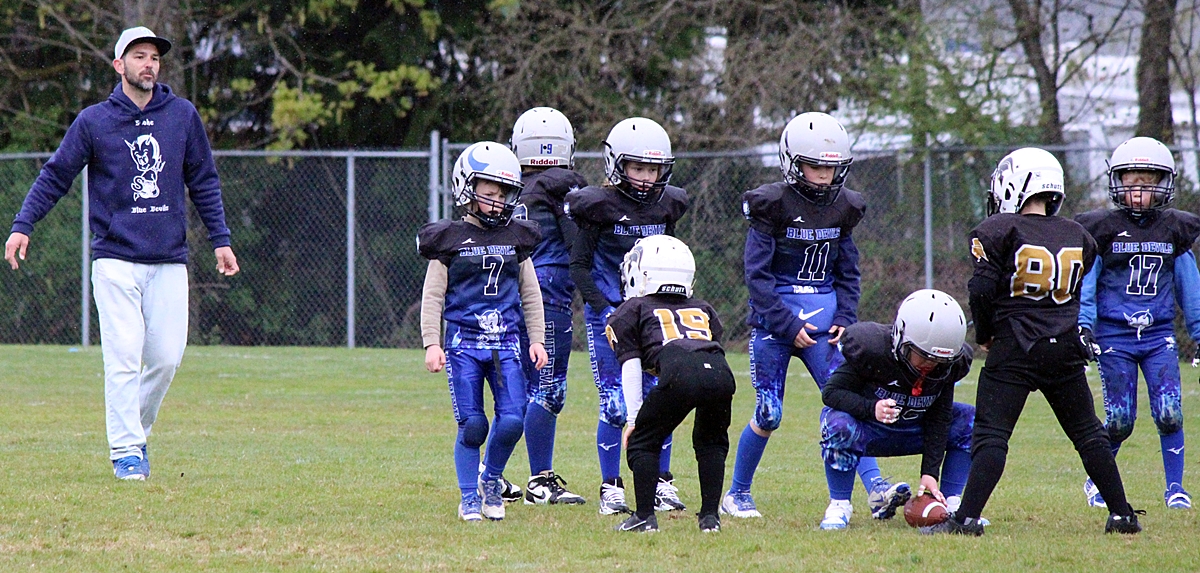 When we left the Sooke Blue Devils were handily in the lead, #11 and #19 scored multiple touchdowns between them. It looks like it’s 6 aside football and the coaches are on the field to provide direction. More details to follow.